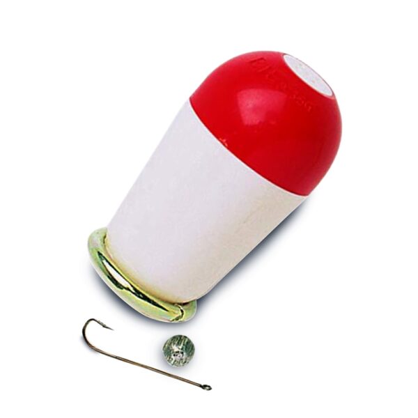 Marken ligger inni duppen under kastet, og synker ned til ønsket dyp når den har landet på vannet.