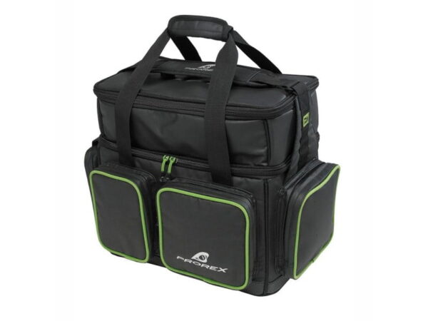 Prorex Lure Bag L This extra big carrying bag offers enormous space for the storage of lures and supplies. The bag is delivered including 2 big tackle boxes of 36×22.5×5.5cm and one extra tall soft plastic lure box of 36×22.5×8.5cm. The tall box can store extra big soft plastic lures which do not fit into flat lure boxes. The rubberized bottom prevents the intrusion of moisture from below. Both front and side pockets offer space for smaller lure boxes. The padded shoulder strap ensures carrying comfort. The big main compartment above the boxes offers storage space for big pieces and can be organised into different sized compartments via velcro dividers as required. All of the bag’s outer material is water repellent._