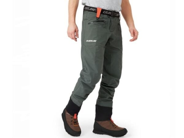 Buksene har glidelås i front som gjør de enkle å ta av- og på. Bak glidelåsen er det vanntett materiale som brettes ut når denne åpnes. Lette, fleksible og solide grusbeskyttere sørger for å holde sand og skitt ute og forhindrer unødvendig slitasje på neoprenesokkene. Laxá midjevadere er utstyrt med to vannavvisende horisontale lommer (m.a.o ikke 100% vanntette) med glidelåslukking. Ved siden av glidelåsen sitter det en D-ring for å feste tilbehør. Midjen er elastisk, justerbar og buksen er noe høyere i ryggen. Leveres med elastisk belte med Guidelinelogo og fargen er Algae Green.