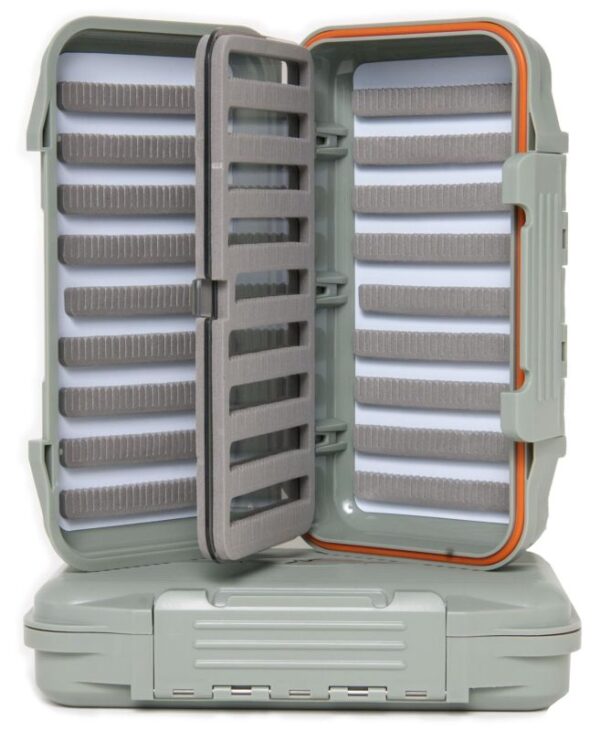 Double Slit Foam Swing Leaf – Denne har 36 rader med slit foam og veldig generøs kapasitet. Etter vår mening en perfekt boks som rommer det aller meste du trenger. Midtdelen har solide hengsler slik at den ikke faller ut eller løsner lett, men er enkel å trekke ut hvis du ikke ønsker å ha den med. En perfekt boks til å bygge opp et konsept for f.eks elvefiske. Kjør fallskjermfluene på bunndelen opp til krok 12, mindre duns krok 16-18 på midtdelen og på andre siden midt og topp setter du klekkere, nymfer og spent spinners (fluer med lavt volum).