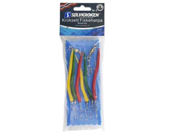 Kroksettene er montert på en foam bakplate, og har hvirvel i ene enden og hempe i andre enden, er enkle å feste til snøret.