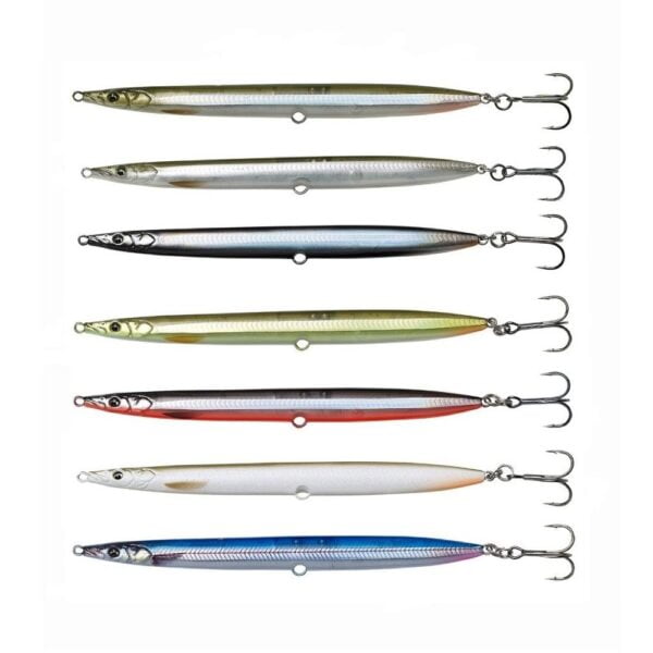 Based on a 3D Scan of a Real Sandeel. Swims with a seducing slim S-curve, head slight up. On the stop, the lure flutters and rolls backwards – triggering hard strikes. The lure has a built-in rattle chamber, that sends out a loud clicking sound, when twitched. Extreme long cast design for amazing coverage. Supplied with both a single and a treble hook, with the option to add the treble hook to the belly as well.