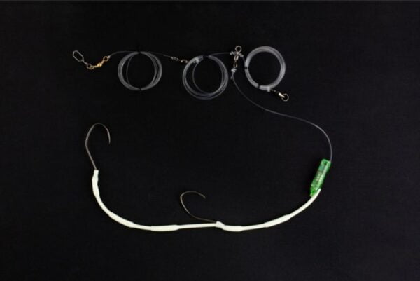 Dette er riggen for deg som er på jakt etter skikkelig storfisk. De to kraftige krokene i #11/O er tilrettelagt for å rigge en hel agnfisk av adskillig størrelse, og riggen er ment fisket etter stilleliggende- eller drivende båt. Riggen er knytt på kraftig snøre og utstyrt med slitesterke og lysende Lightsleeves, som både lokker fisk og beskytter snøret mot skarpe fisketenner. Riggen er også utstyrt med en tynnere knekkfortom fra en swivel og ned til søkket. På denne måten sliter en bare søkket dersom en setter seg skikkelig fast i bunnen. Et must for de som er på jakt etter havets store jegere. L. 380cm/Ø. 1,2mm/1,4mm/0,70mm Krok #11/O