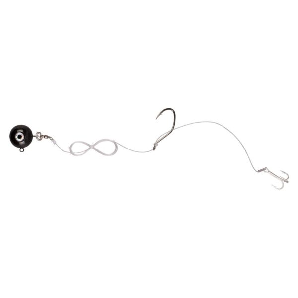 Søvik Halibut Rig er en agnfiskerigg laget spesielt for kveitefiske med hel agnfisk. Riggen består av et Flygende øye på 400 gram, utstyrt med Heavy Duty-splittring, kulelagerswivel og en to meter lang monofortom i 1,2mm. I enden av fortommen, med ca. 20 centimeters mellomrom, er det festet en solid Catfish-krok i størrelse 9/O og en stingertreble i størrelse 4/O. Riggen egnes med hel fisk, der snuten tres på den fremste kroken og stingeren festes i ryggen på agnfisken. Husk en god fortom av mono eller fluorkarbon mellom braiden og Søvik Halibut Rig. 400g / 2m. 1,20mm + 9/0 + 4/0 Stinger