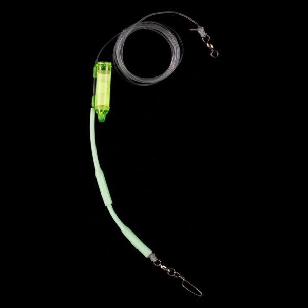 Søvik Waterlight Leader er en to meter lang fortom i 1.0-millimeters monosnøre, utstyrt med swivel i den ene enden, hempeswivel i den andre enden og med en grønn Søvik Waterlight glidende på selve fortommen.