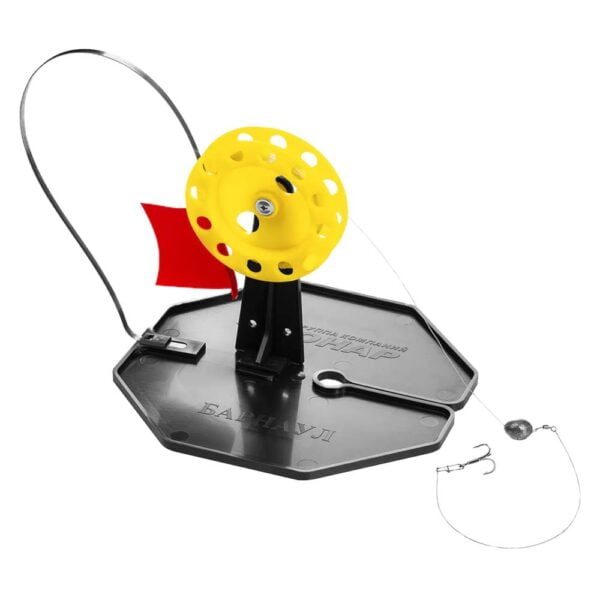 Ferdig rigget for Gjeddefiske med sene,søkke,stålfortom og treble krok. Flagget spennes opp på spolen og låser av på innstilt dybde. Når fisken tar agnet spretter flagget opp og spolen gir fri line med minimal motstand. Motstanden på spolen kan justeres ved å stramme skruen i senter. Spole diameter 85mm/Disk diameter 210mm