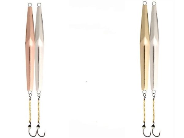 Wanda lokkemeite til isfiske. Et slikt avlangt lokkemeite med tyngdepunktet midt på kroppen kan slippes veldig raskt ned til abborstimen før stimen rekker å svømme videre. Metoden fungerer godt når det er stim av røye, harr og sik også. Påmontert lokkemeitekrok.